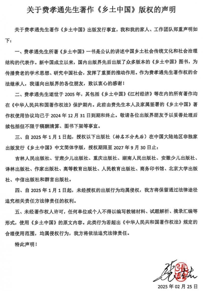 声明表示,费孝通先生逝世于2005年,其包括《乡土中国》《江村经济》等在内的所有著作均在《中华人民共和国著作权法》保护期内。此前由费先生本人及家属签署的《乡土中国》著作权使用协议均已于2024年12月31日到期和终止。